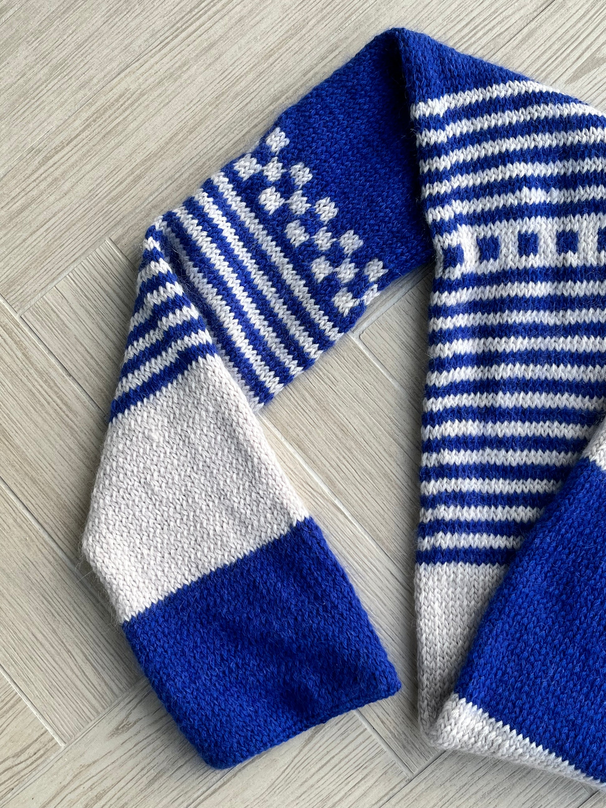 This design combines mohair softness with wool structure to create a double-layered, fully reversible scarf featuring stripes, colour-blocks, and playful checker textures.